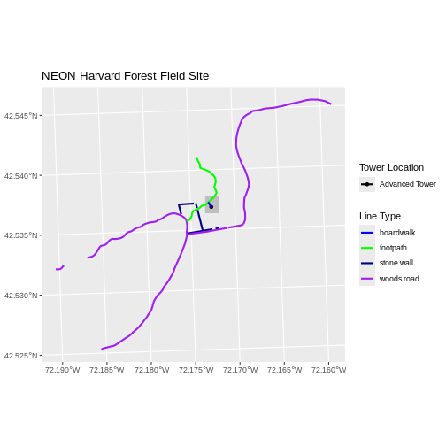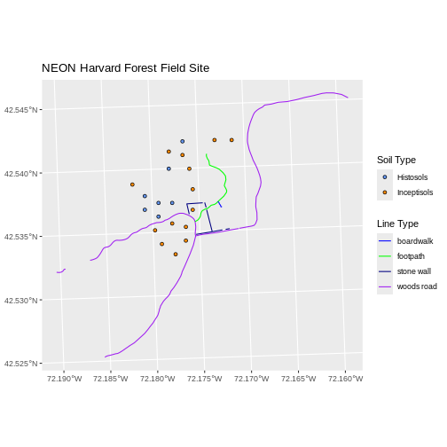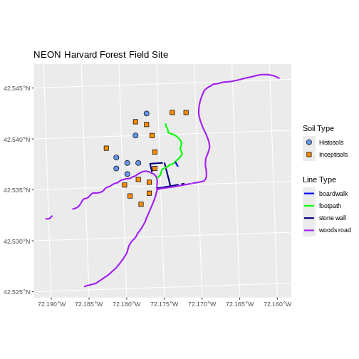 NEON-DS-Site-Layout-Files/HARV/PlotLocations_HARV.shpESRIshapefile, create a map of study plot locations, with each point colored by the soil type (soilTypeOr). How many different soil types are there at this particular field site? Overlay this layer on top of thelines_harvlayer (the roads). Create a custom legend that applies line symbols to lines and point symbols to the points.Modify the plot above. Tell R to plot each point, using a different symbol of
